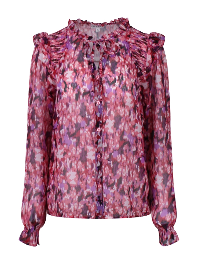 Sierlijke chiffon blouse met smock werk op de schouder. Deze blouse heefte een opvallend kleurrijk vlekkenpatroon met vele details zoals ruches op de schouder, ronde de hals en een kleine V hals welke met een koordje kan worden gesloten of gestrikt. Tijdloos en goed te combineren met jeans, rok of blazer.