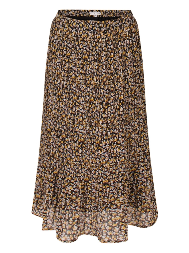 Lange chiffon plisse rok. Deze rok heeft een onderrok en een meerkleurig vlekken patroon.