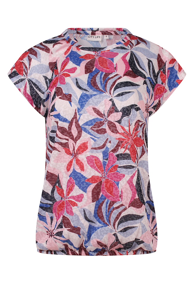Geef je outfit een frisse en vrolijke uitstraling met dit stijlvolle dames T-shirt. Het shirt is voorzien van een kleurrijk multicolor bloemenpatroon dat zorgt voor een speelse en vrouwelijke look. Dankzij het elastiek in de taille valt het T-shirt mooi aangesloten en creëert het een flatterend silhouet.