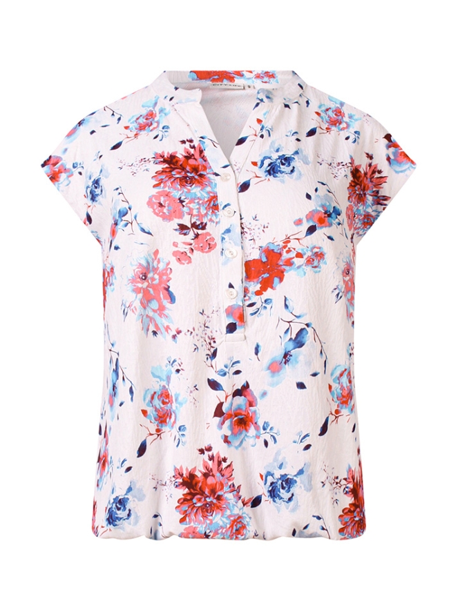 Dit elegante T-shirt voor dames combineert comfort met een vrouwelijke touch. Het heeft een subtiele V-hals met sierlijke knoopjes voor een verfijnde uitstraling. Gemaakt van gestructureerde bloemenstof, straalt het T-shirt een zachte en speelse charme uit. Dankzij het elastiek in de taille sluit het mooi aan en accentueert het je silhouet op een flatterende manier. Perfect te combineren met zowel jeans als rokken voor een casual-chique look.