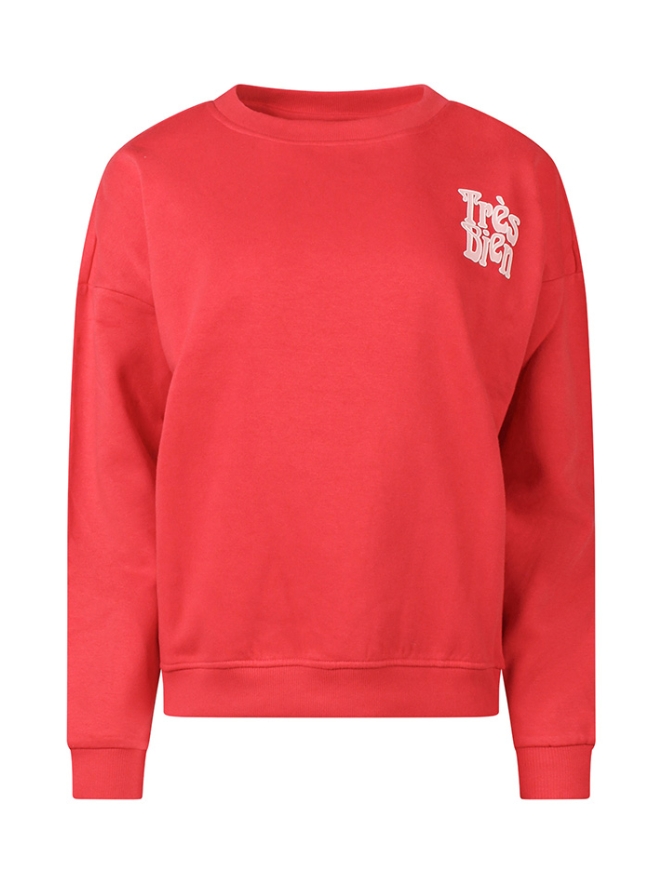 Tres Bien! Deze ontzettend zachte sweater is met fleece aan de binnenkant en trek je het liefst nu gelijk aan! Met mooie grote trendy print op de rug in te leuke voorjaarskleurtjes!