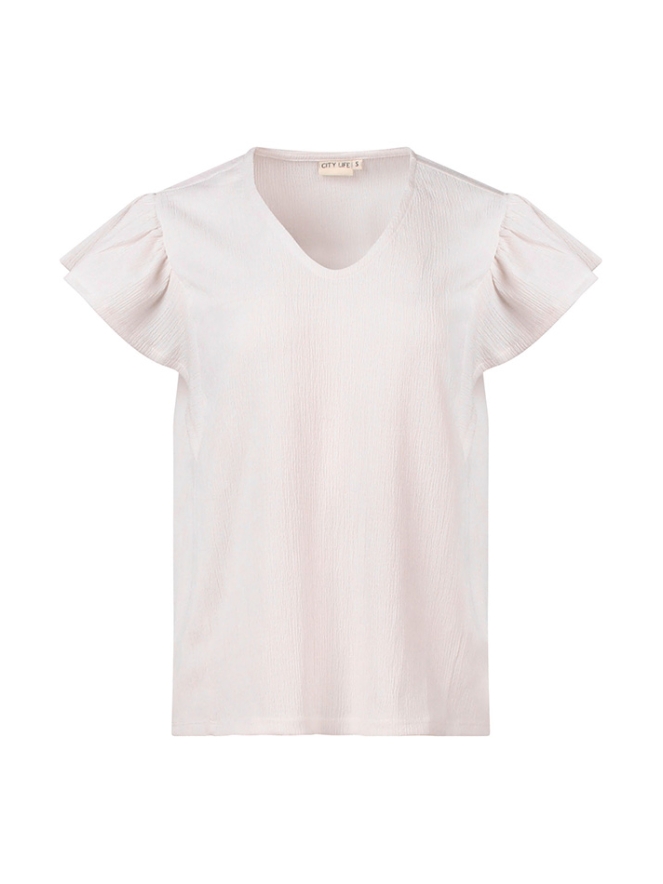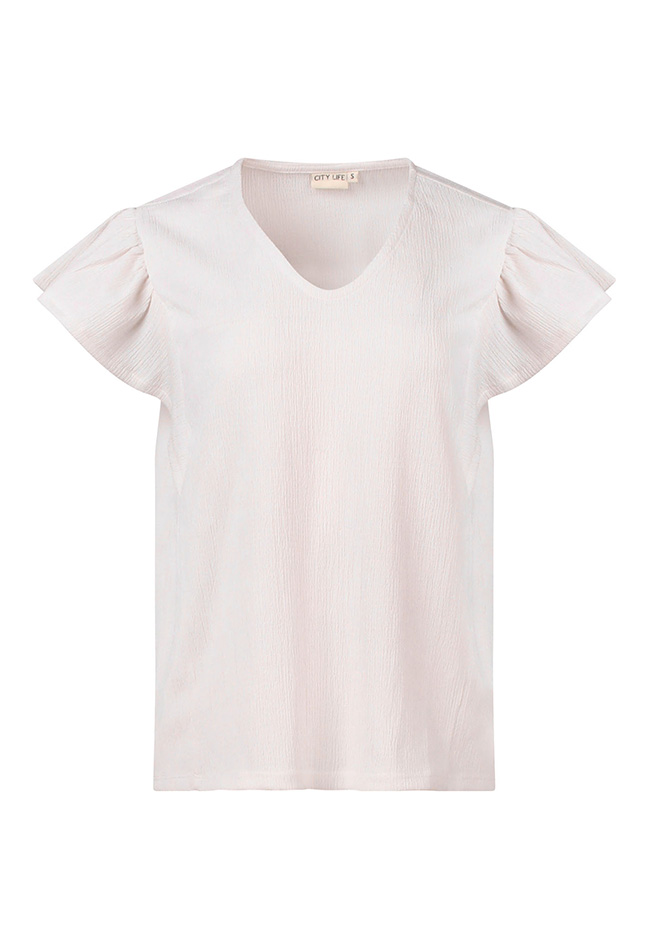 Deze elegante dames top combineert comfort met een vrouwelijke touch. Gemaakt van volledig crincle-stof, voelt de top licht en luchtig aan, perfect voor zowel casual als chique looks.