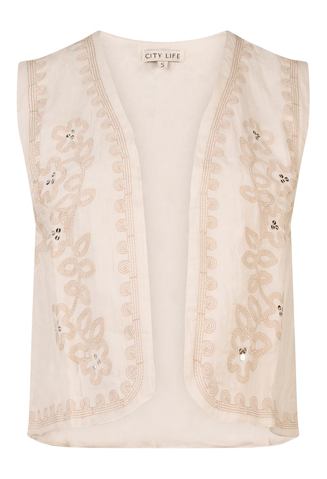 Geef je outfit een speelse, vrije uitstraling met dit prachtige bohemian gilet voor dames. Gemaakt van luchtige mousseline stof voelt het gilet heerlijk licht en comfortabel aan. Perfect voor zonnige dagen en lange festivalavonden. Het verfijnde borduurwerk in combinatie met subtiel glinsterende pailletten zorgt voor een unieke, handgemaakte look die meteen in het oog springt. De losse pasvorm en open voorkant maken het gilet ideaal om te layeren over een top, jurk of bikini.