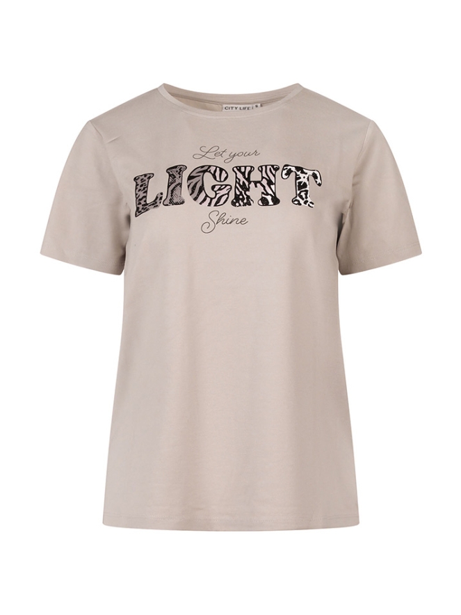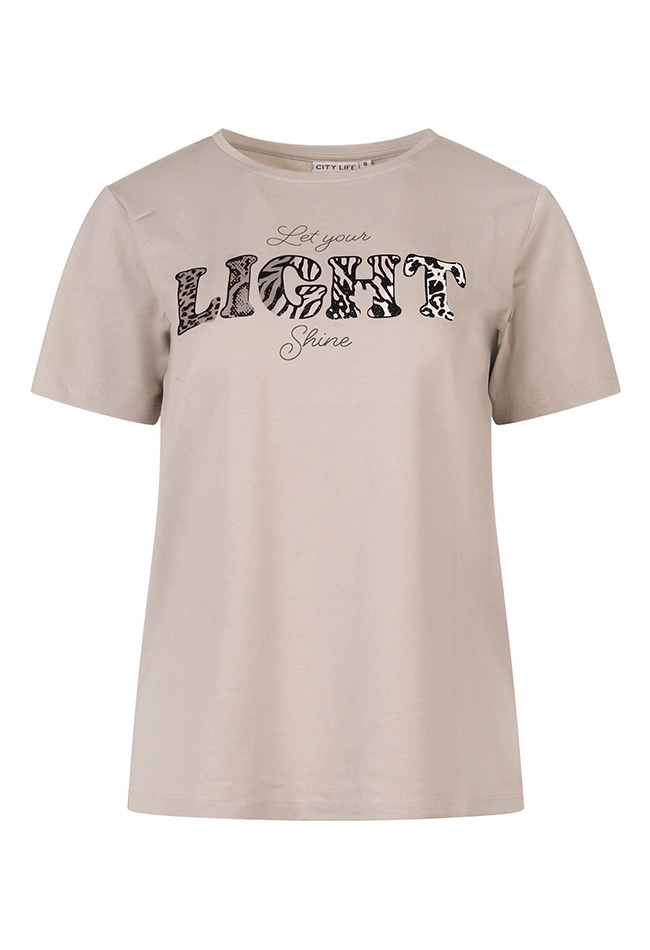 Comfortabel T-shirt met korte mouwen en een inspirerende opdruk: ?Let your light shine?. Gemaakt van zacht en ademend materiaal voor een fijne pasvorm en optimaal draagcomfort. Perfect voor een casual outfit en eenvoudig te combineren met jeans, shorts of een rok. Een stijlvolle en positieve toevoeging aan je garderobe.