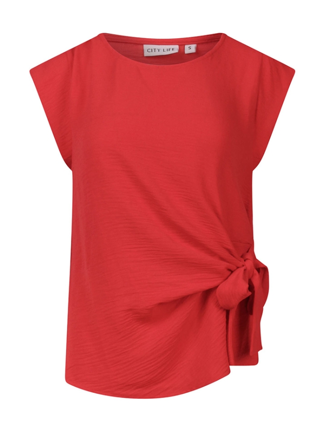 Dames top van crinkle stof met een speels knoopdetail vooraan. Voorzien van korte kapmouwen en een ronde hals, voor een luchtige en stijlvolle look.