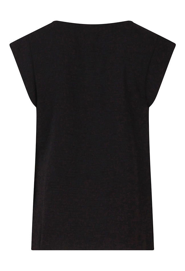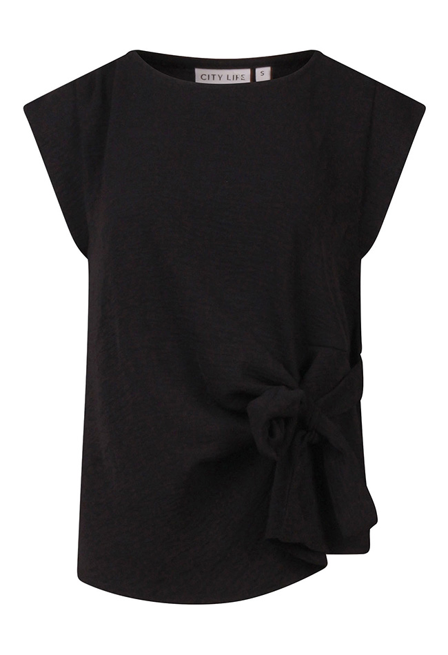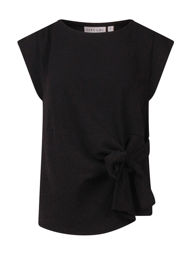 Dames top van crinkle stof met een speels knoopdetail vooraan. Voorzien van korte kapmouwen en een ronde hals, voor een luchtige en stijlvolle look.