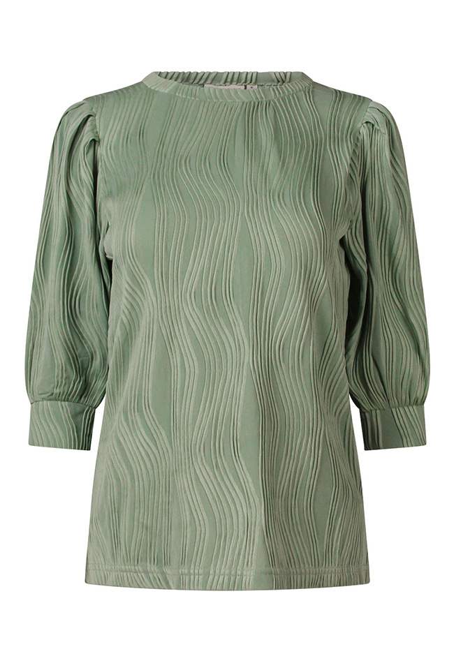 Dames shirt van jacquardstof met een elegant golfpatroon. Het shirt heeft pofmouwen en een klassieke ronde hals, voor een stijlvolle en vrouwelijke look.