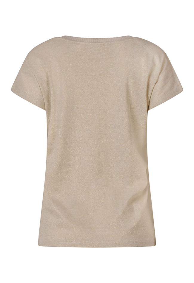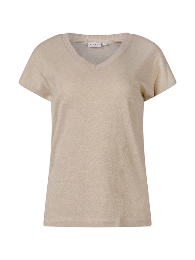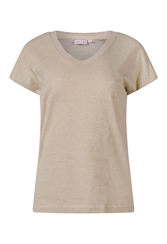 Dames shirt met glanzende Lurex-details, een flatterende V-hals en aangeknipte korte mouwen voor een moderne en feestelijke uitstraling.