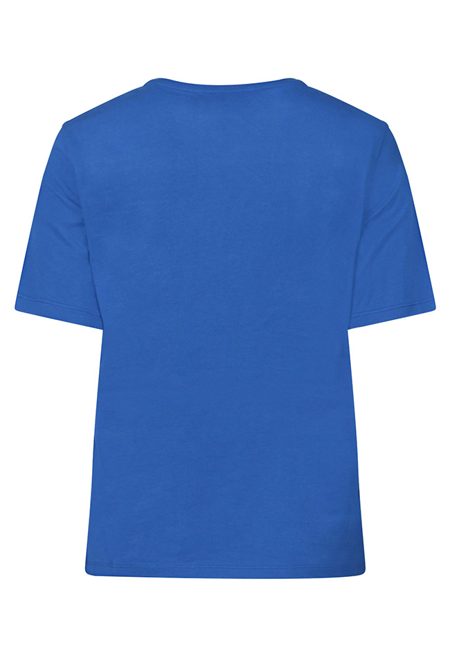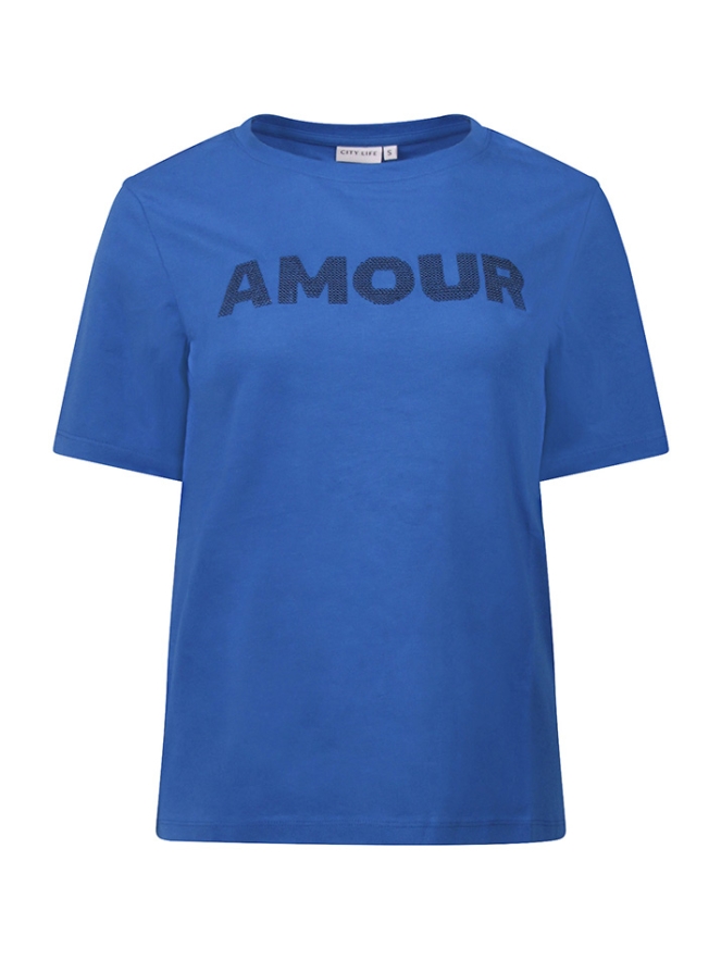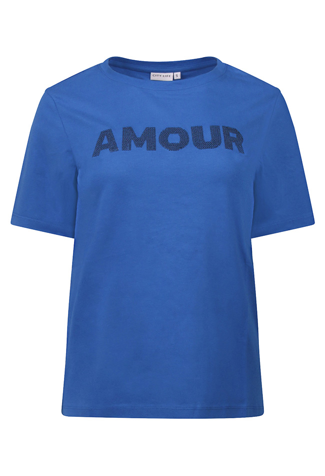 Dames T-shirt met korte mouwen en een ronde hals. Op de voorzijde staat de tekst AMOUR, de tekst is stijlvol uitgevoerd met pailletten voor een subtiele glans en een modieuze uitstraling.