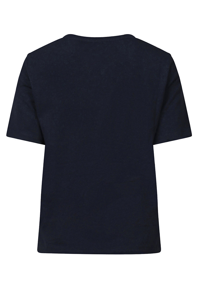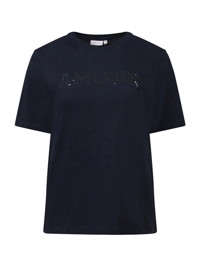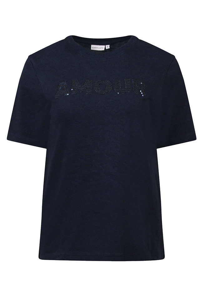 Dames T-shirt met korte mouwen en een ronde hals. Op de voorzijde staat de tekst AMOUR, de tekst is stijlvol uitgevoerd met pailletten voor een subtiele glans en een modieuze uitstraling.