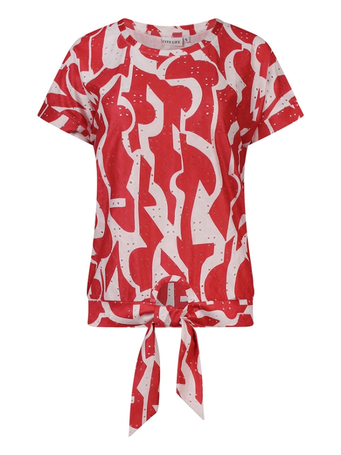 Deze geknoopte dames top met korte mouwen is perfect voor warmer weer of om te combineren onder een jasje. Het ajourpatroon zorgt voor een luchtige, elegante uitstraling, terwijl de print een trendy en vrouwelijke twist geeft. De geknoopte voorkant maakt het geheel extra charmant en biedt een flatterende pasvorm die zowel casual als chic gedragen kan worden. Combineer met een jeans voor een relaxte look of met een rok voor een meer verfijnde outfit.