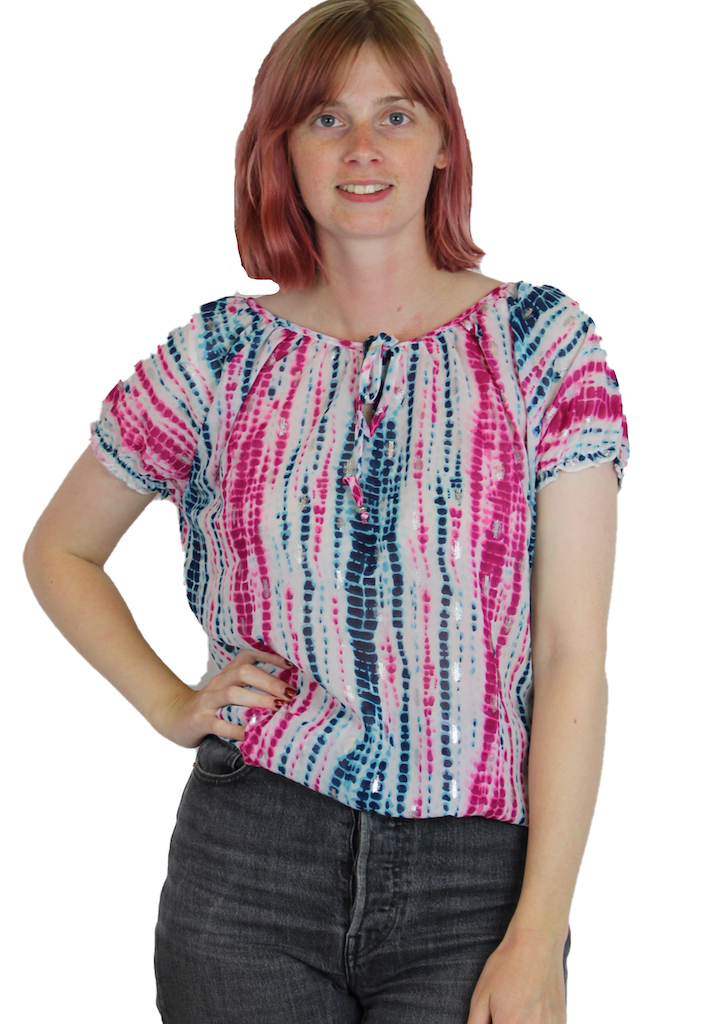 Chiffon blouse van City Life. De blouse heeft een print met glitter vlekjes. De mouw heeft een ruche en er zit elastiek in de onderkant van de blouse. Er zit een strikje in de hals. Valt groot. Materiaal: 100% polyester. Wassen op 30 graden, niet bleken, niet in de droger, kan gestreken worden.