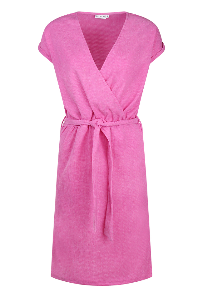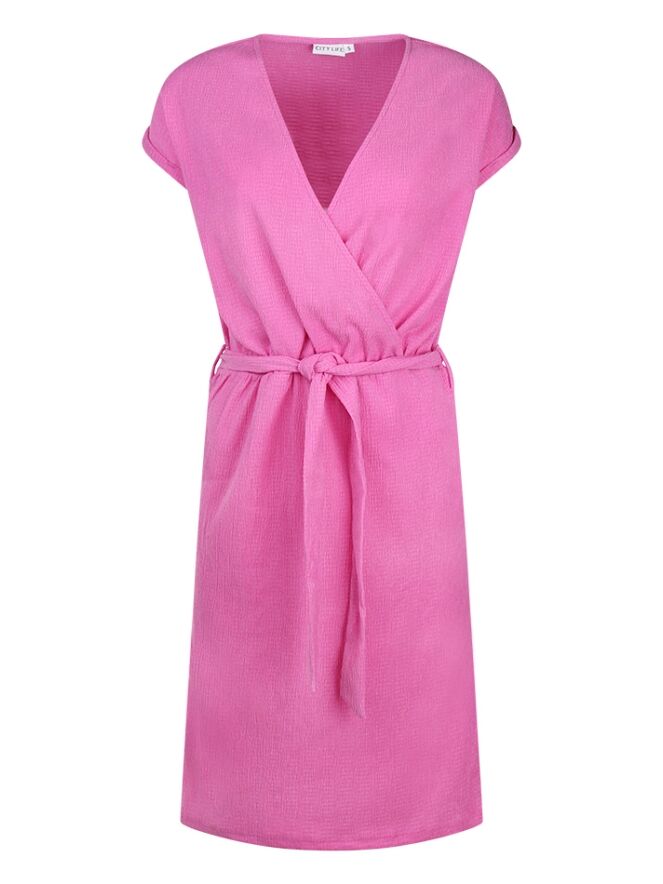 Crinkle jurk met korte mouwen een overslag aan de bovenkant en een strikdetail om de elastische tailleband.