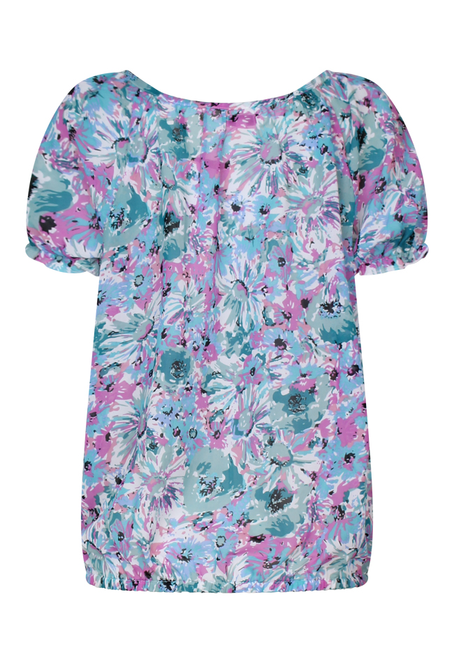 Top met korte mouwen en bloemen print, de voorkant van de hals kan gestrikt worden.