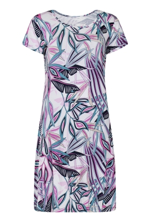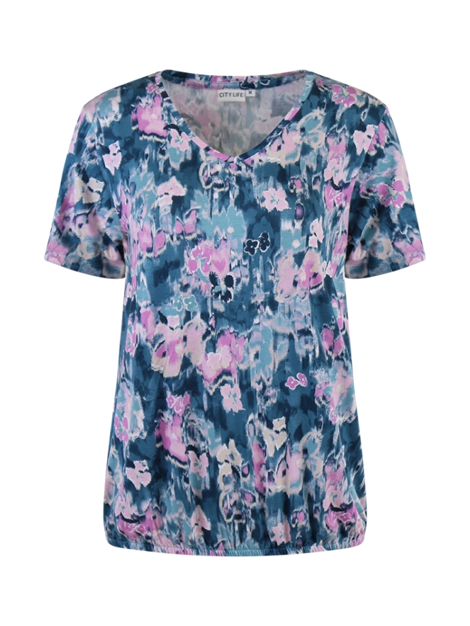 T-shirt met een allover aquarel bloemenprint. Het t-shirt heeft korte mouwen een V-hals en aan de onderkant van het t-shirt zit een elastiek.