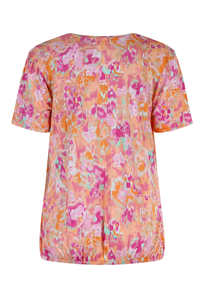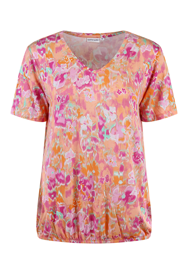 T-shirt met een allover aquarel bloemenprint. Het t-shirt heeft korte mouwen een V-hals en aan de onderkant van het t-shirt zit een elastiek.