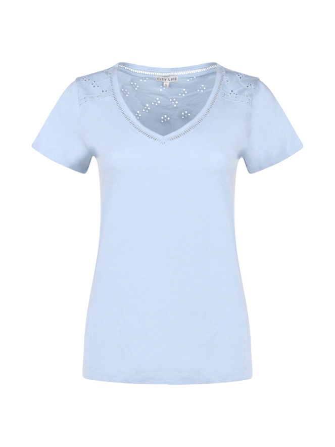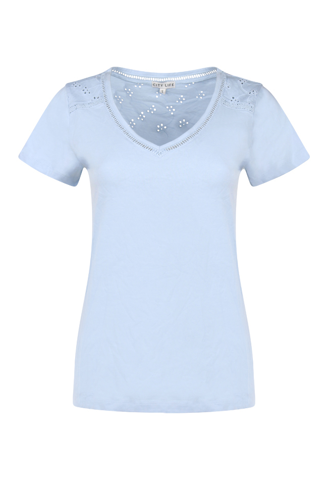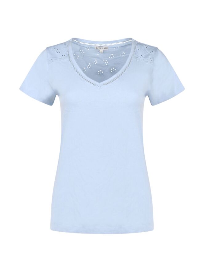 T-shirt met v-hals en broderie anglaise op de schouder en achterkant.