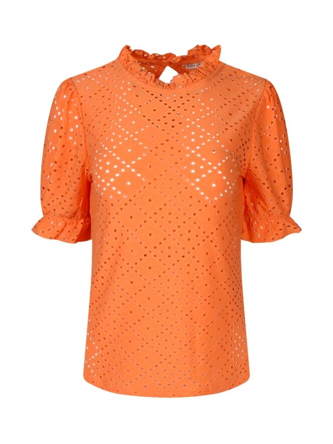 Deze top van ajour heeft een pofmouw en ruche rond de hals. Aan het uiteinde van de mouw zit een elastiek en op de achterkant ter hoogte van de hals zit een druppel uitsparing.