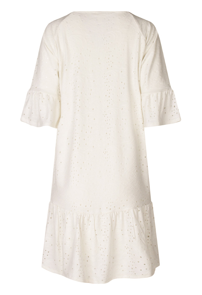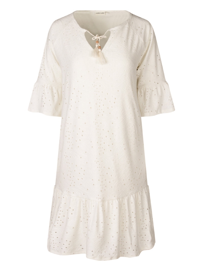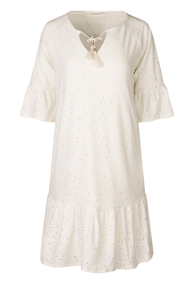 Deze jurk laat je stralen! De halve mouwen met raglan inzet voegen een speelse touch toe terwijl de ajourstof voor een on trend look zorgt. Het rokdeel is verfraaid met een ingezette strook, wat een subtiele, verfijnde twist geeft aan het ontwerp. Of je nu een dag op het strand doorbrengt of een zomers feestje bijwoont, deze jurk biedt de perfecte combinatie van comfort en elegantie voor elke gelegenheid.