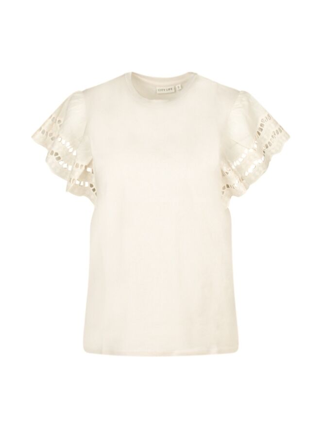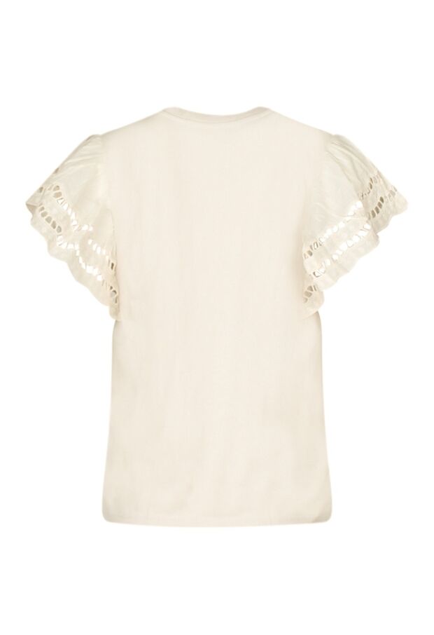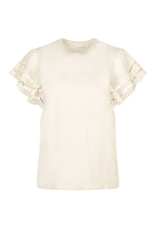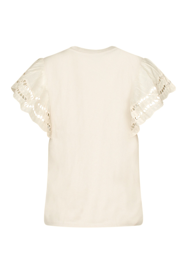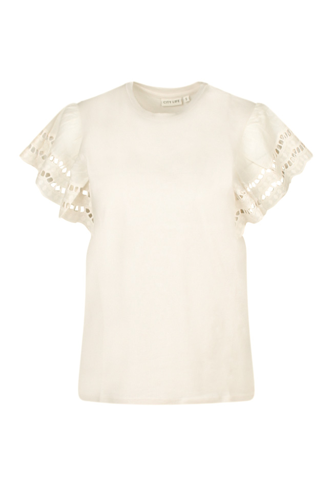 He cutie! De bijzondere kapmouw van deze trendy top die is gemaakt van ajour broderie voegt een uniek element toe aan dit stijlvolle shirt. Een super leuke aanvulling voor een comfy look als jij naar een feestje gaat, de supermarkt binnen loopt of op een terrasje zit! Waar wacht je nog op?