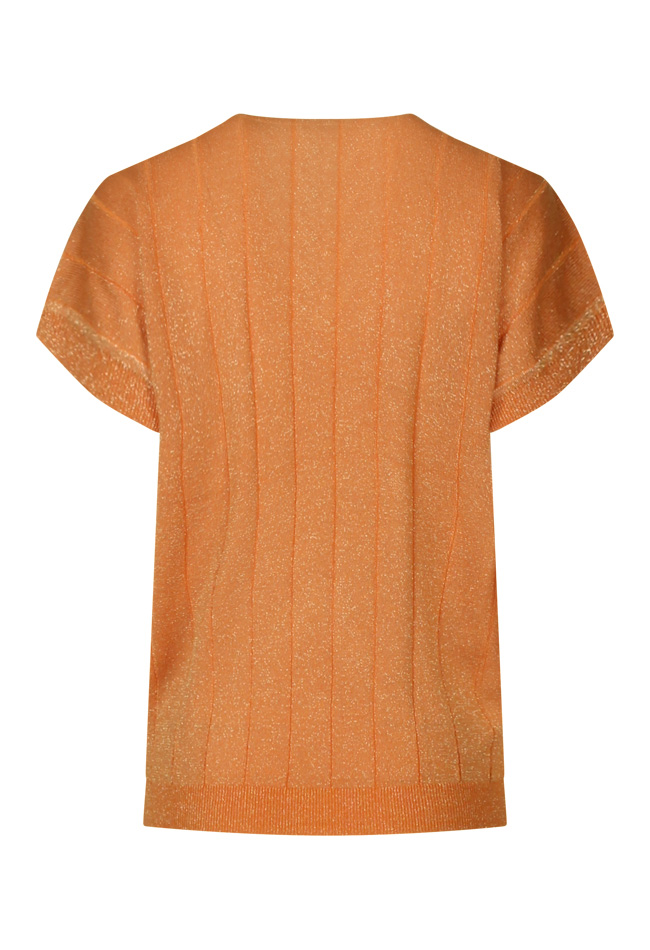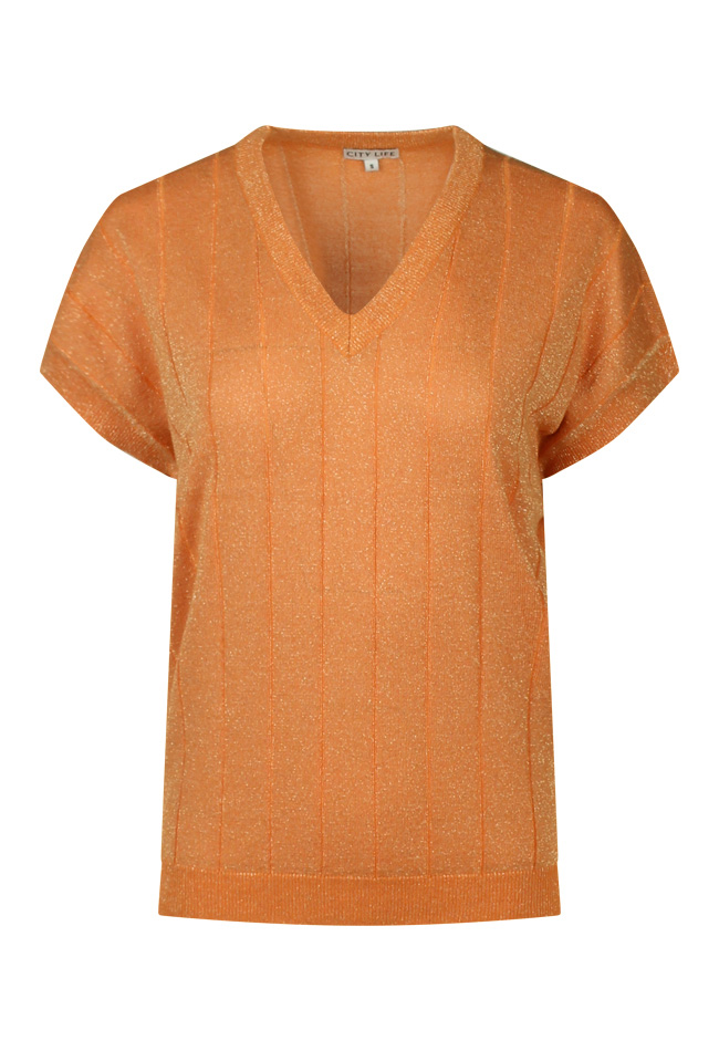 Deze top met glitter heeft een V hals, verticaal streep patroon in het breisel en een klein kapmouwtje.
