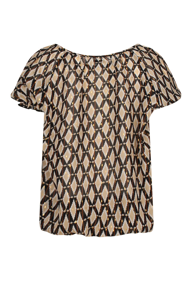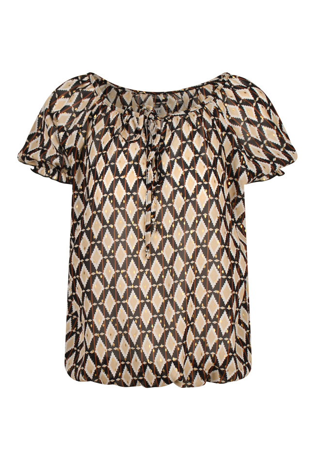 Deze top met opvallend patroon, straalt elegantie uit en laat je stralen met een dosis flair. Het elastiek bij de taille geeft deze top een golvend effect, waardoor het een flatterende pasvorm krijgt. De ronde hals wordt verfraaid met een druppeluitsparing, die wordt vastgehouden door een koordje. Leuk af te kleden met een denim jack als het wat frisser is dan verwacht.
