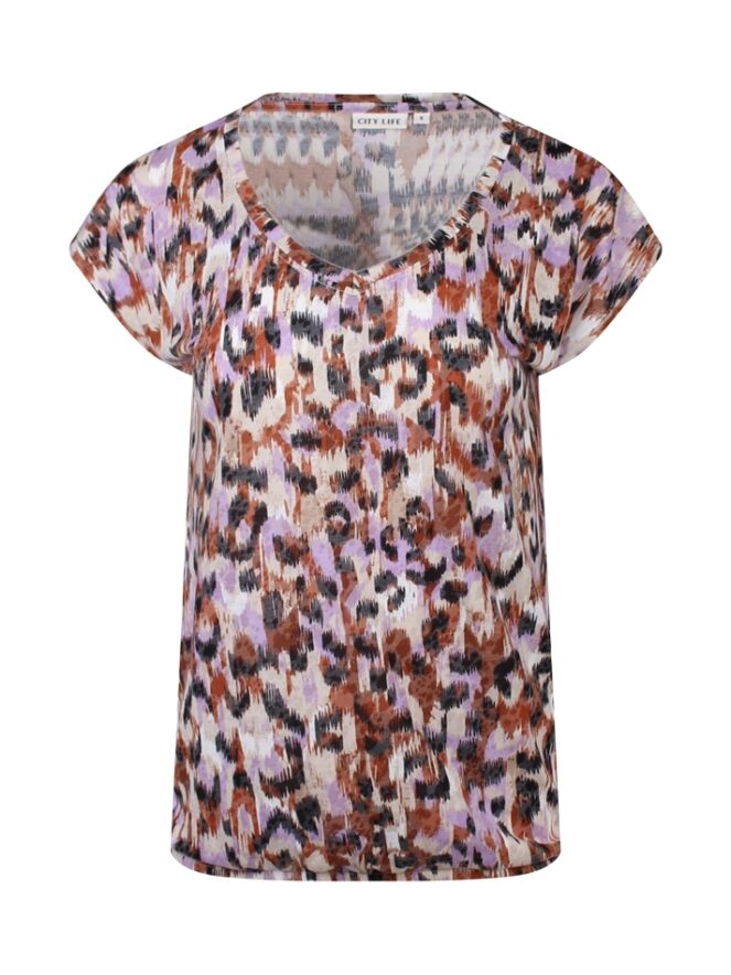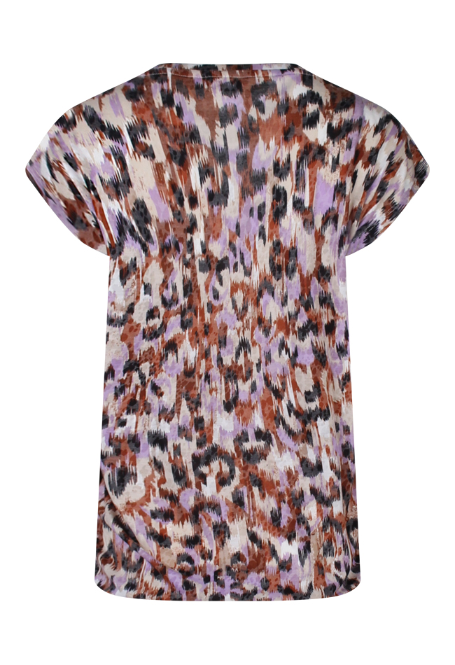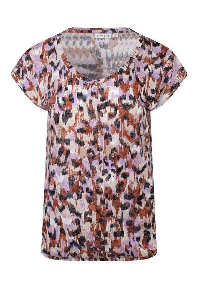 Dit T-shirt heeft een subtiele V hals met onderaan in de taille een elastiek wat het shirt iets laat bollen.