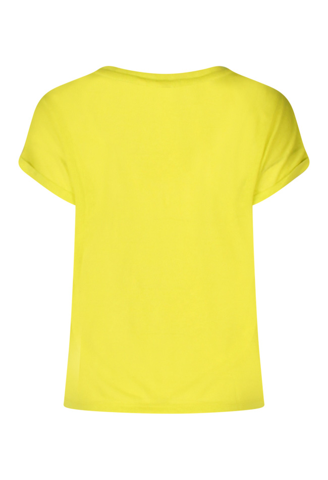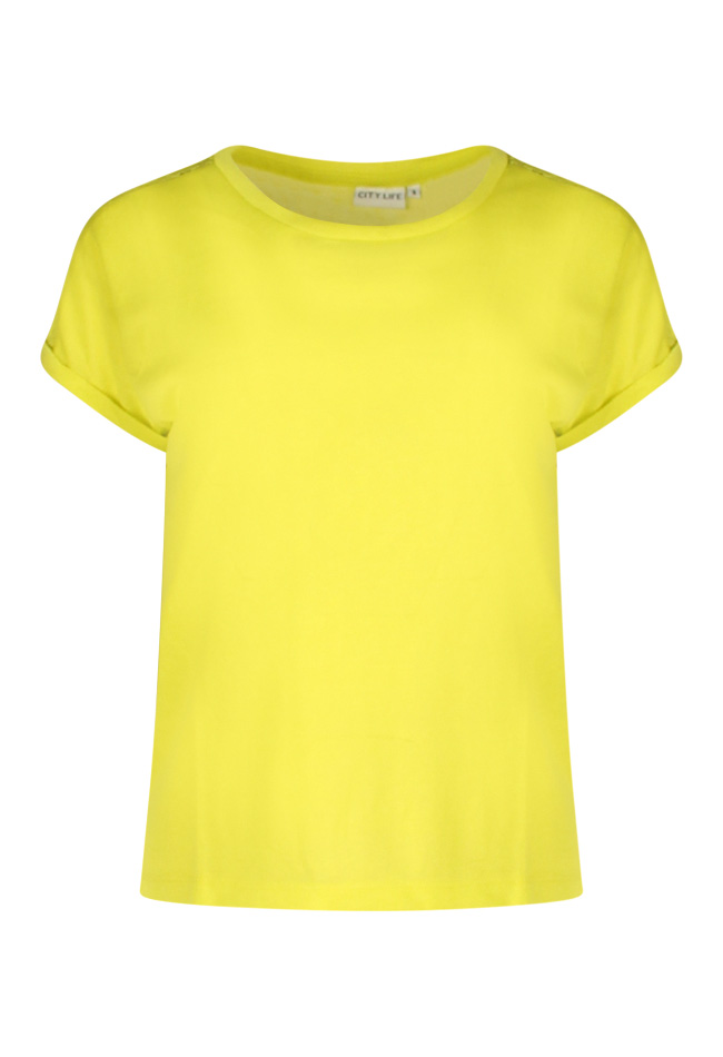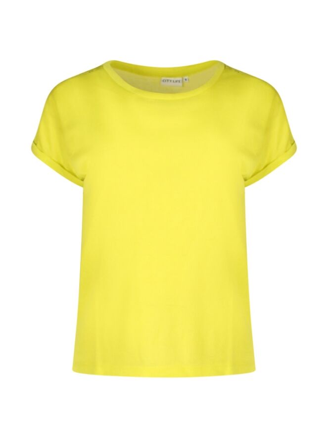 Dit licht doorschijnende shirt heeft een omslag mouw met over de schouder een sierlijke bies.