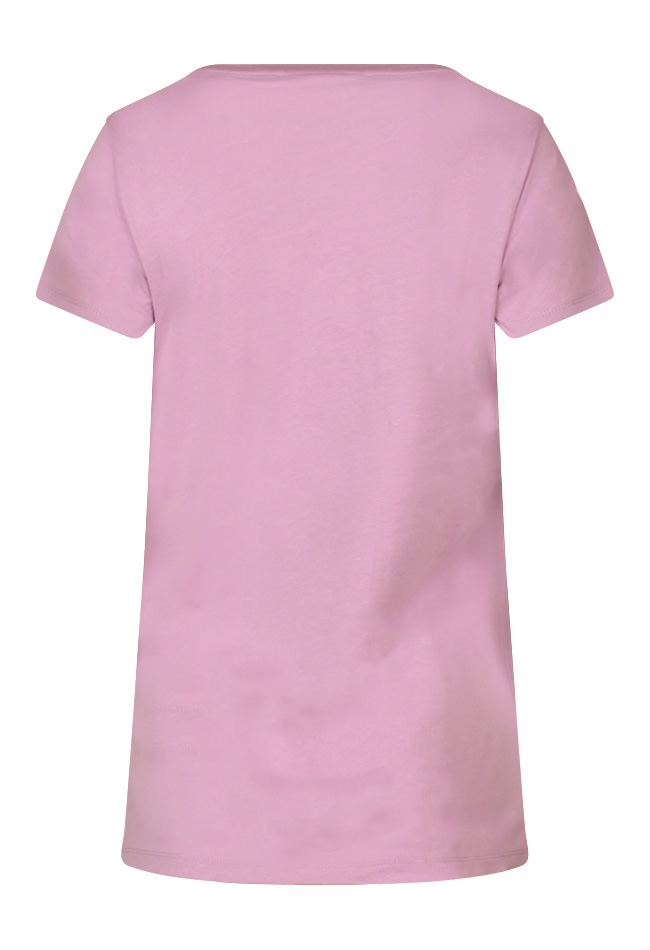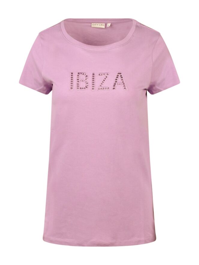 Dit T-shirtje met de tekst IBIZA voorop heeft doorschijnende letters.