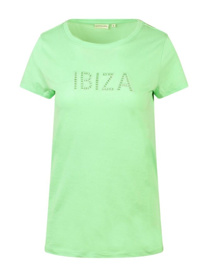 Dit T-shirtje met de tekst IBIZA voorop heeft doorschijnende letters.