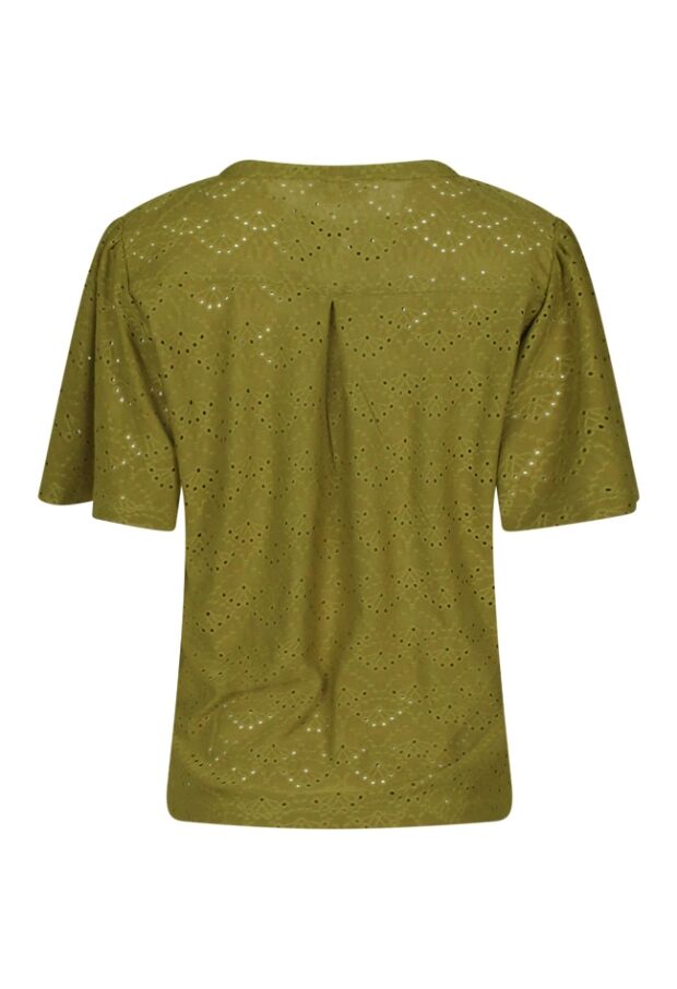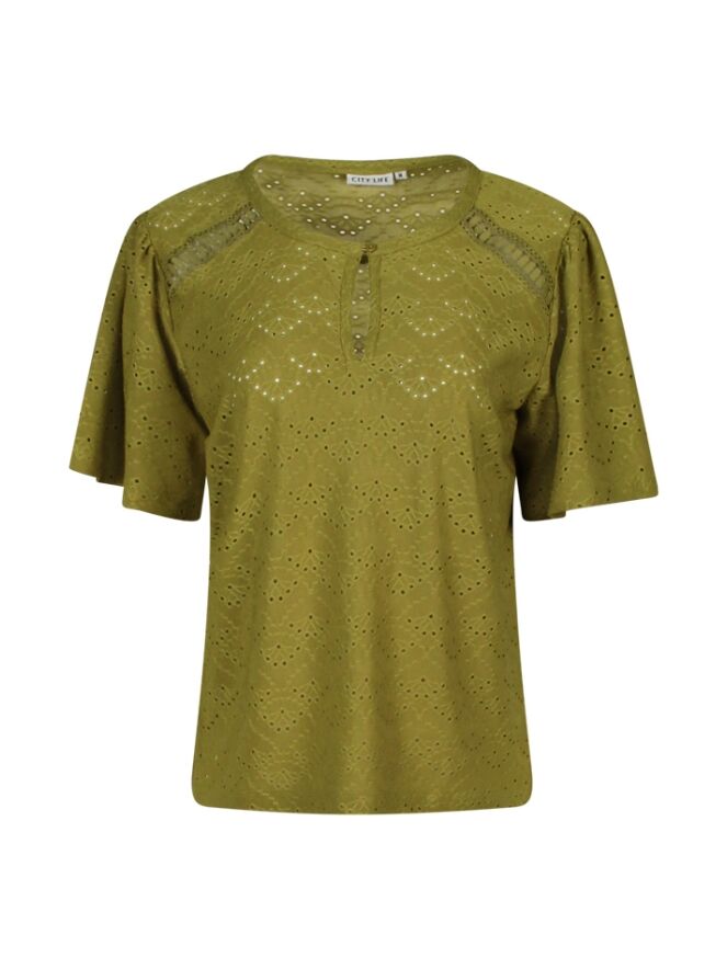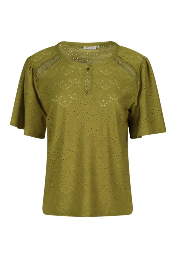 Deze top van mooie kwaliteit ajour heeft een prachtige vlindermouw en gesloten druppeluitsparing aan de voorkant. Basic shirt ideaal voor onder colberts, gilets en andere leuke jasjes.