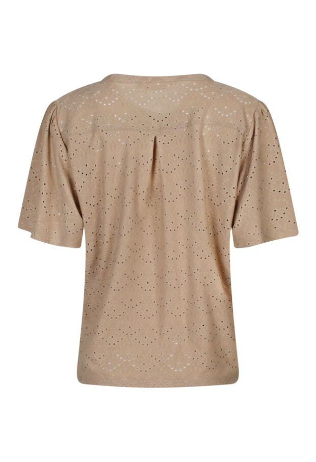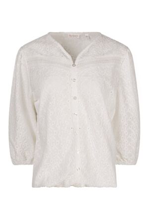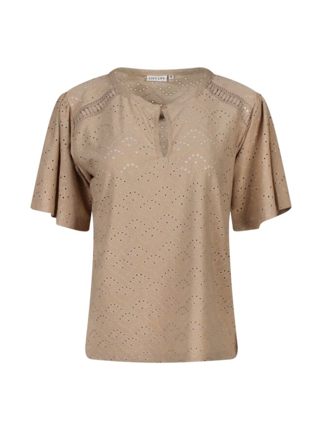 Deze top van mooie kwaliteit ajour heeft een prachtige vlindermouw en gesloten druppeluitsparing aan de voorkant. Basic shirt ideaal voor onder colberts, gilets en andere leuke jasjes.
