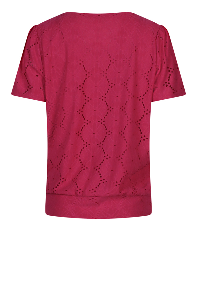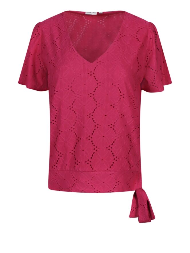 Deze top is gemaakt van een verfijnde bloemajour stof en heeft een elegante V-hals. Het strikdetail aan de onderkant voegt een speelse, vrouwelijke touch toe voor een perfecte balans tussen stijl en comfort.