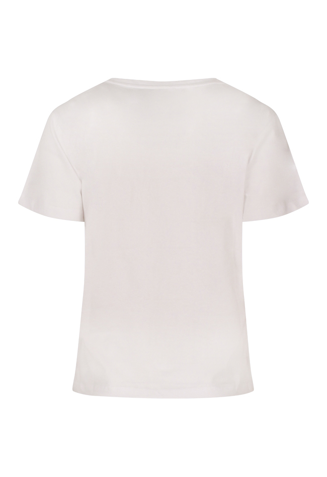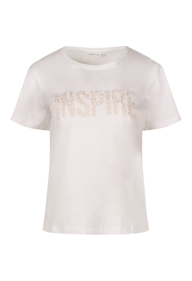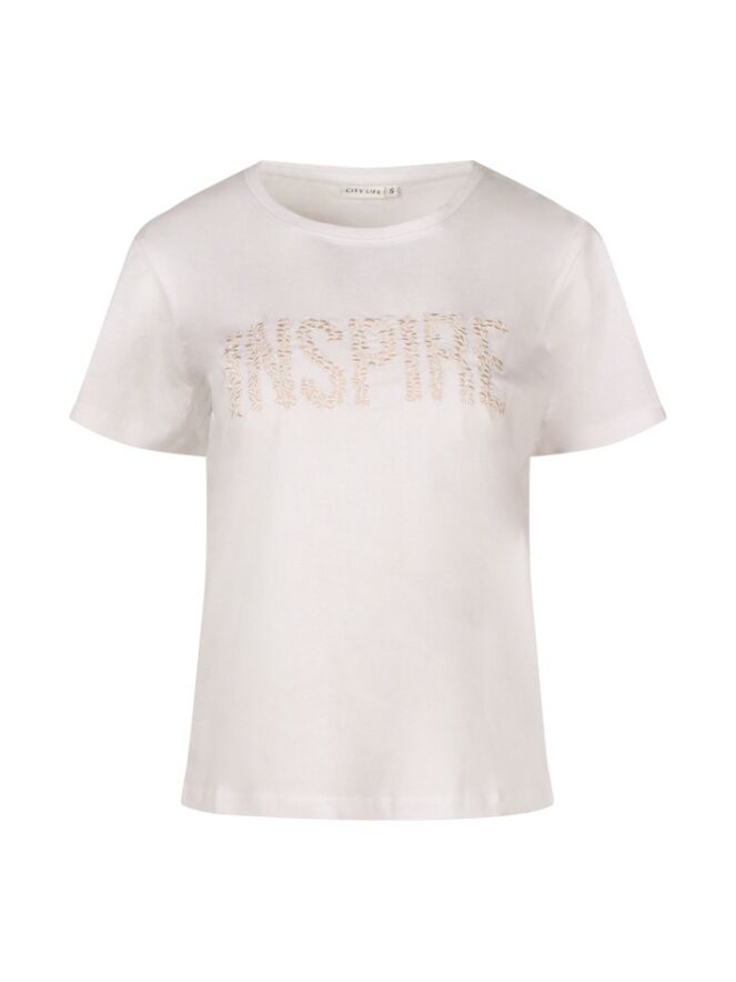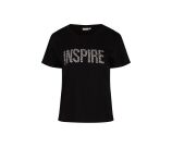Inspire! Dit effen gekleurde T-shirt met geborduurde tekst is uitstekend te dragen onder een blazer door zijn neutrale uiterlijk. Natuurlijk doet deze het ook goed op spijker voor een casual look!