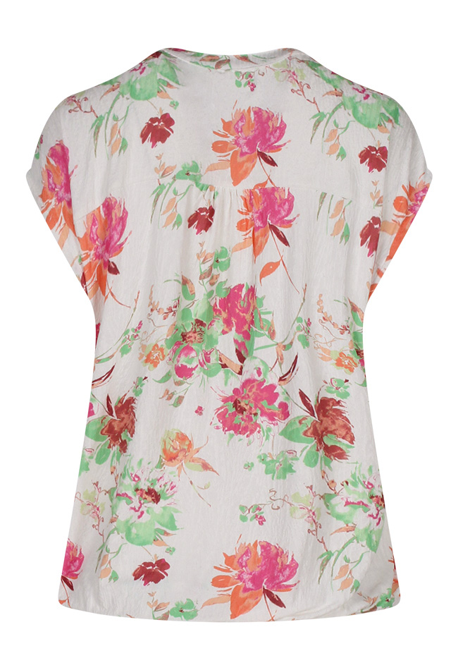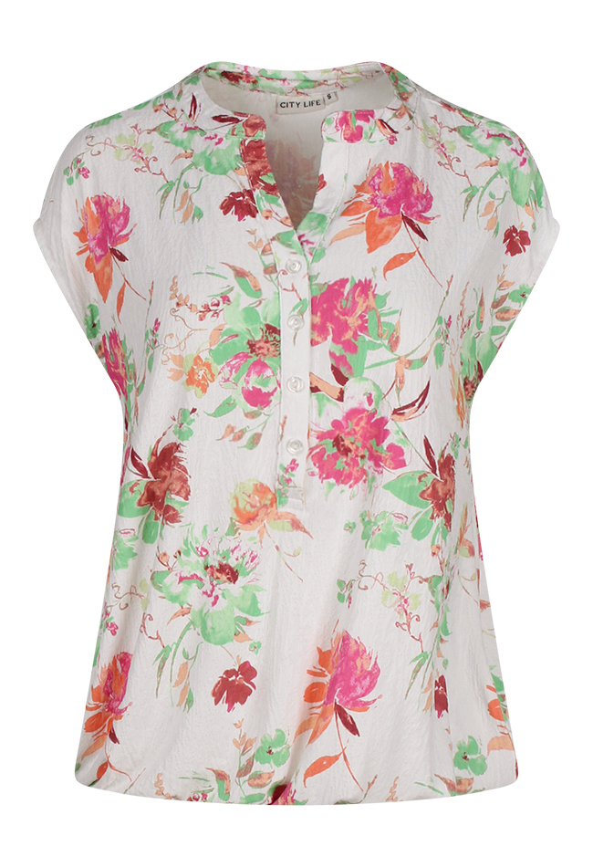 Pretty in flowertops! Deze top met bloemenprint is absoluut een fashionable item. De top gemaakt van een struktuurstof heeft een kleine V-hals en een elastiek rond de middel om de top mooi te laten bollen. Veelzijdig te combineren met rokken en korte of driekwart broeken.
