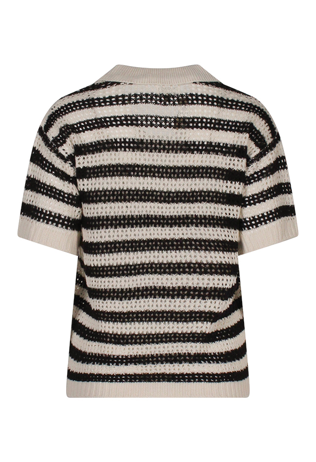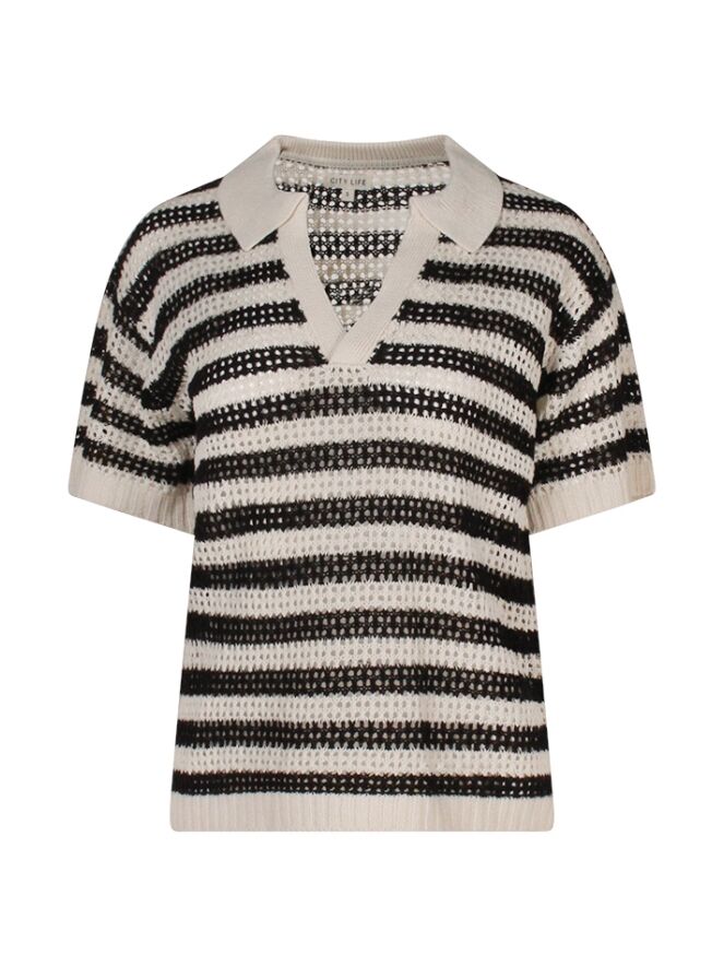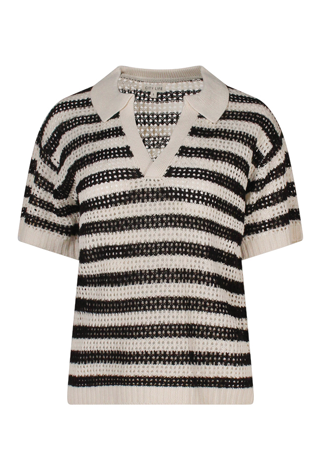 Zomerse luchtige trui van een open ajourbreisel. We adviseren om een hemdje te dragen onder deze trui i.v.m. de doorschijnendheid. Met leuke polokraag en korte mouw. Leuk te combineren met jeans, driekwart, kort of lang!