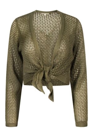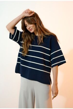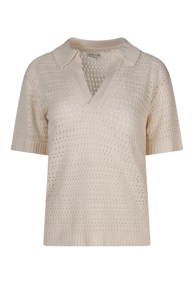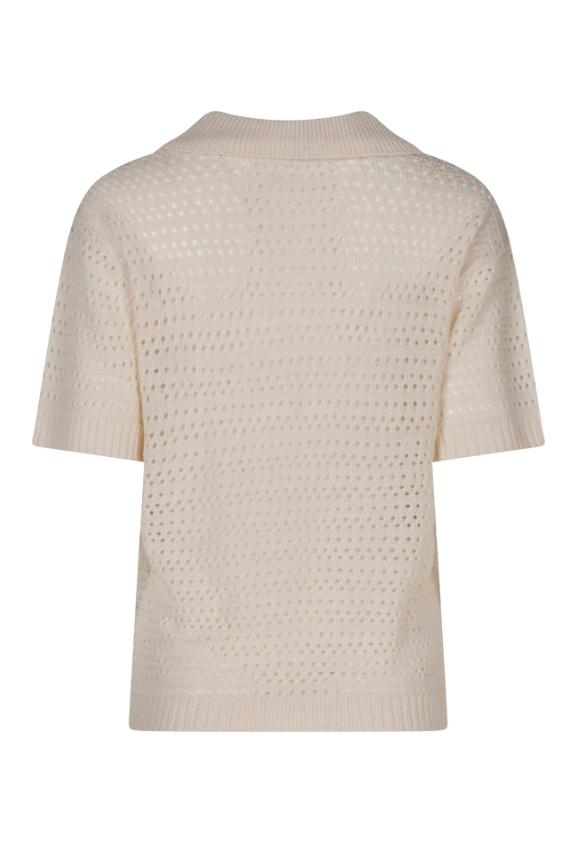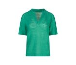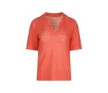 Luchtige dames trui met korte mouwen van open ajour breisel. Advies om er een singlet onder te dragen om doorschijnen te voorkomen. Effen gekleurd.
