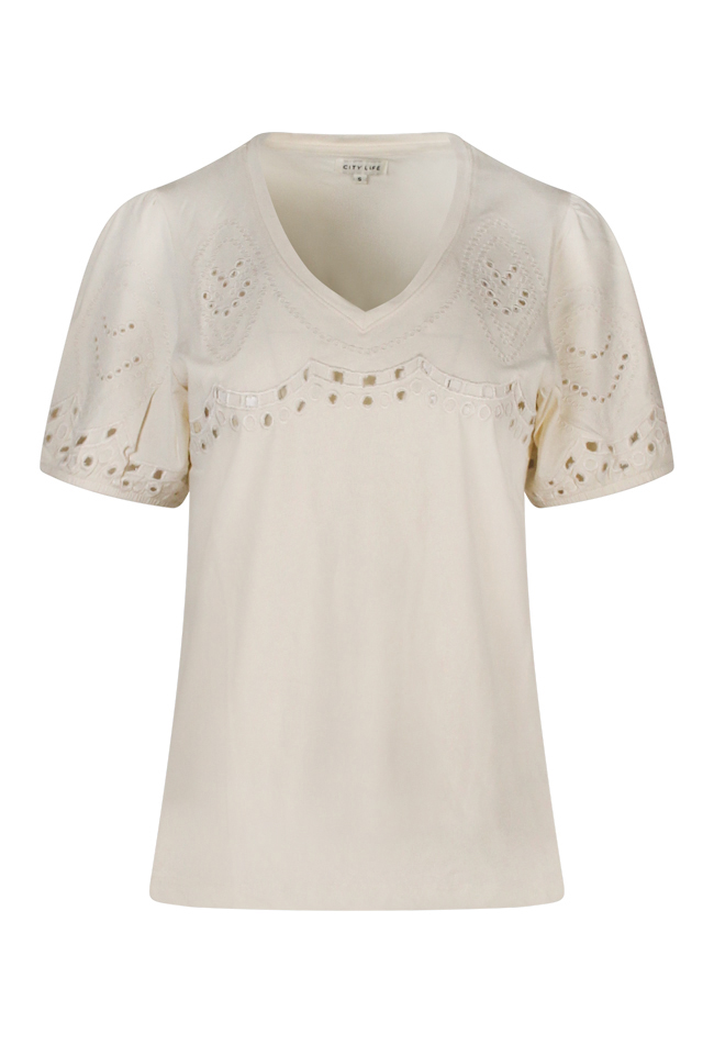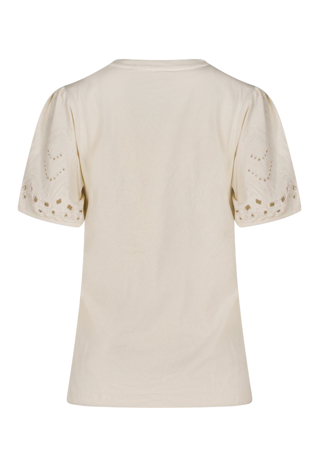 Dit T-shirt met pofmouwen heeft een opengewerkt borduurmotief. Leuk op een korte broek of rok. You go girl!