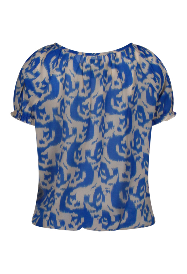 Deze luchtige chiffon top van Citylife is een zomerse blikvanger met een 2-kleurig ikatdessin in blauw-wit of zwart-wit. De ronde hals is afgewerkt met een charmant strikdetail bij de hals, wat zorgt voor een verfijnde touch. De korte raglanmouwen en de onderzijde van de top zijn voorzien van elastiek, wat zorgt voor een comfortabele pasvorm en een subtiel bloezend effect. Perfect te combineren met een jeans of linnen broek voor een stijlvolle en moeiteloze look tijdens warme dagen.
