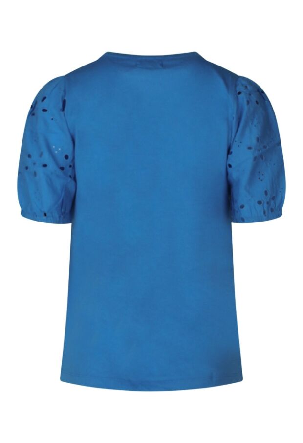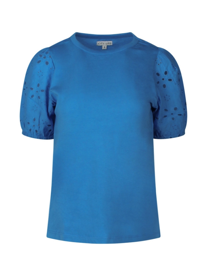 Deze luchtige top is perfect voor warme dagen. Dankzij de speelse pofmouwen van broderie stof krijgt het shirt een vrouwelijke en zomerse uitstraling ? net dat beetje extra voor elke outfit.