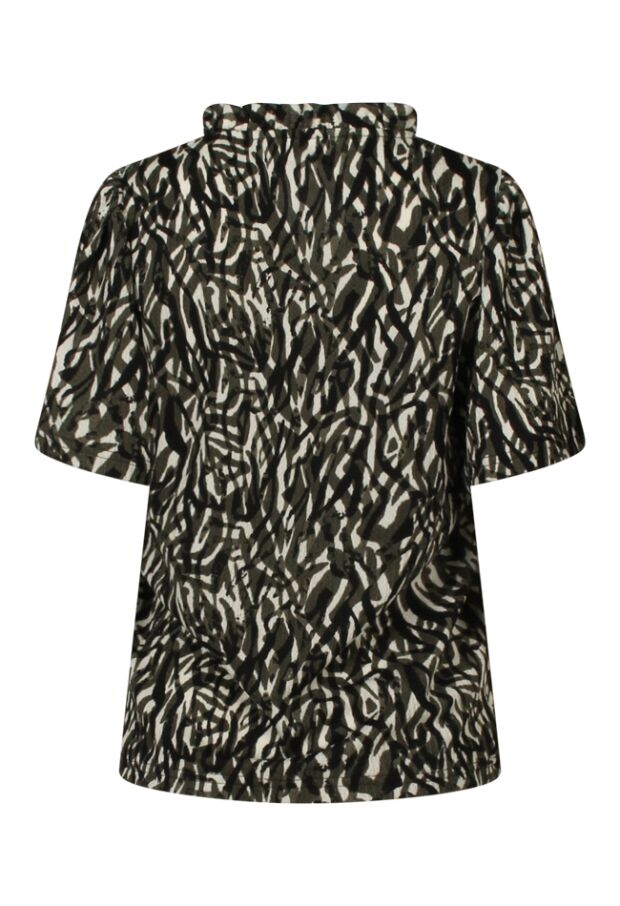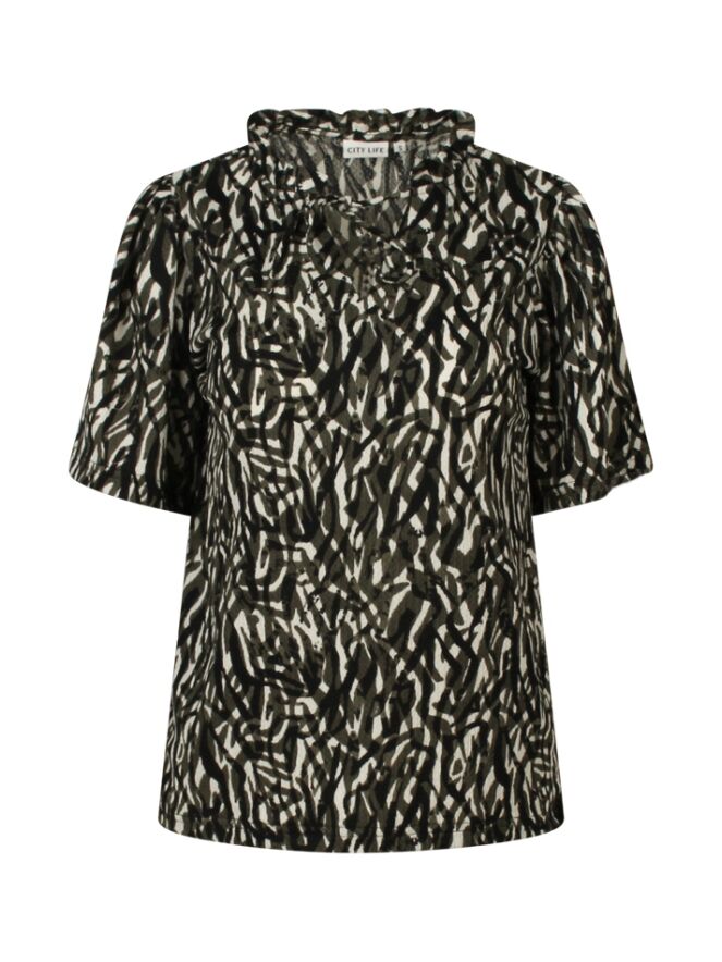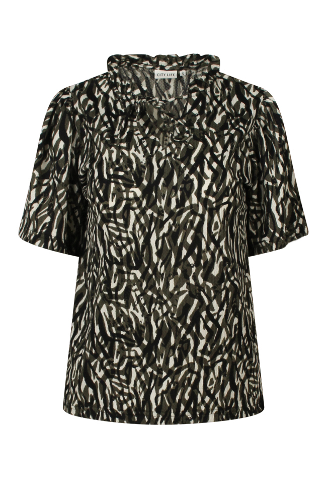 Deze stijlvolle top van Citylife is gemaakt van crinkle stof en heeft een opvallende dierenprint. De V-hals met ruche-detail en het koordje bij de hals voegen een speelse en verfijnde touch toe. De pofmouwen geven de top een extra vleugje flair. Perfect te combineren met een casual broek of een rok voor een elegante, maar toch comfortabele look.