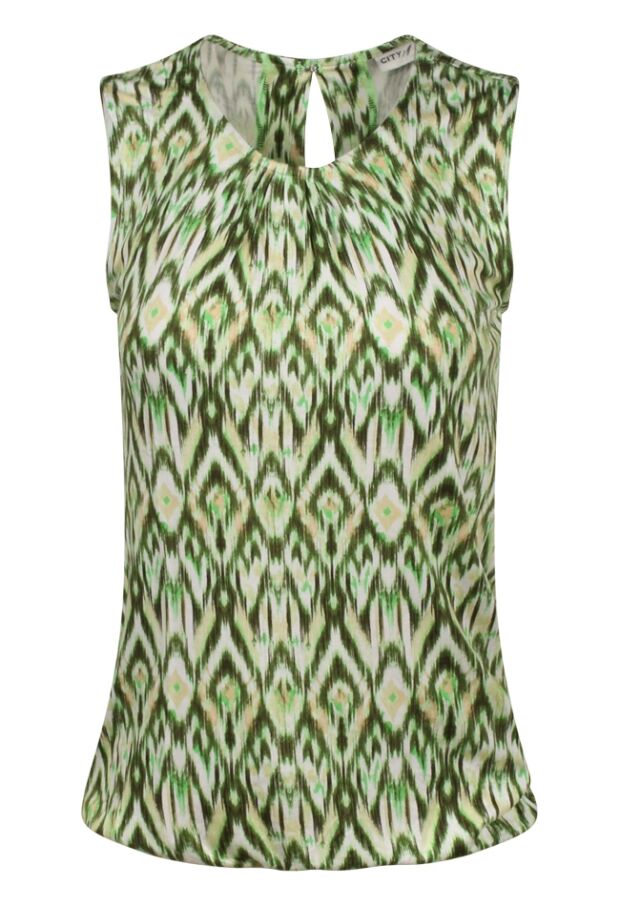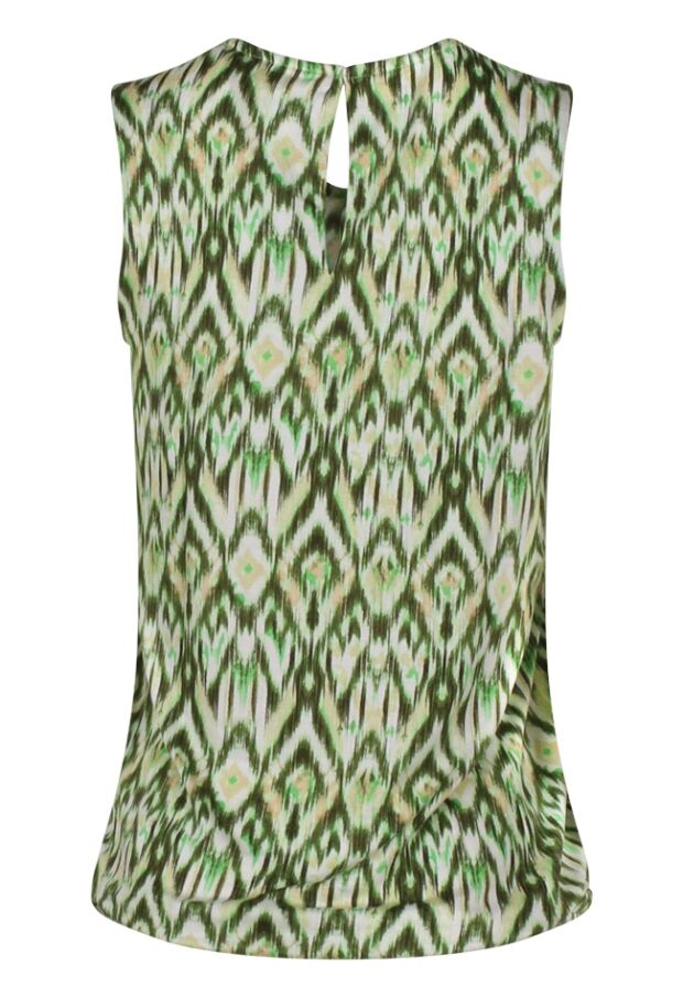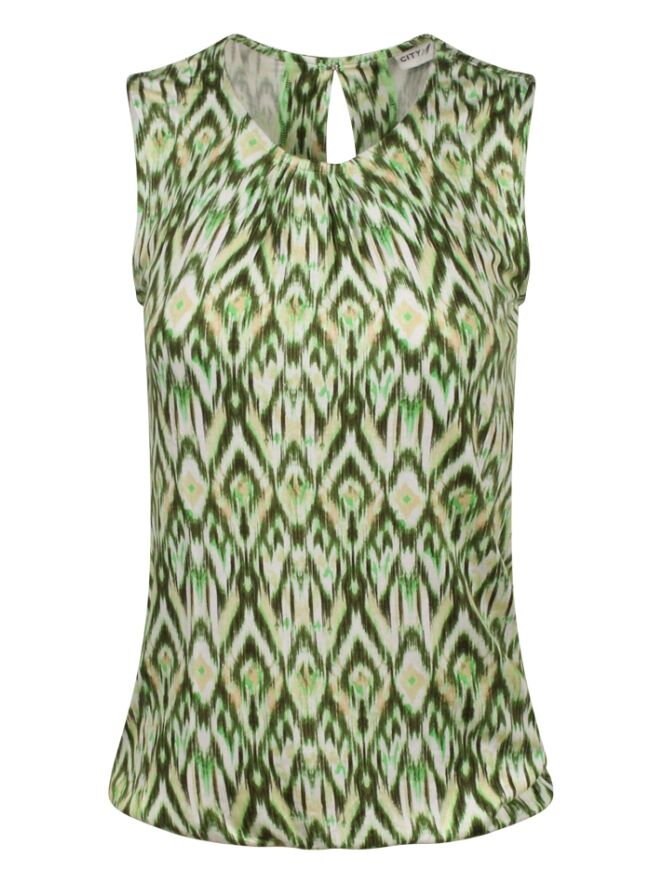 Deze singlets dragen heerlijk door de flexibele T-shirt stof. Op de rug zit een druppeluitsparen welke sluit met een kleine haaksluiting. Met kleurrijke ikatprint welke voor een casual sporty look perfect te combineren is met witte sneakers en een vlotte driekwart broek.
