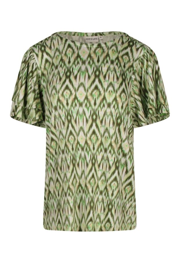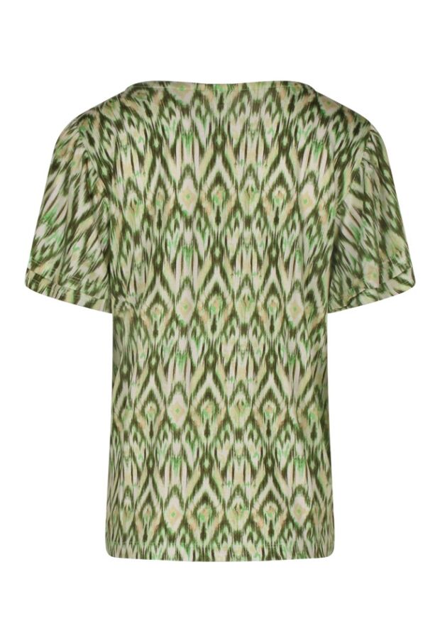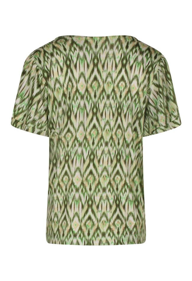Vrolijk T-shirt met een prachtige vlindermouw. Dit shirt met meerkleurig Ikatpatroon houdt de Ikat trend nog even in ere! Draag hem op je jeans of nette pantalon en je bent ready to go!