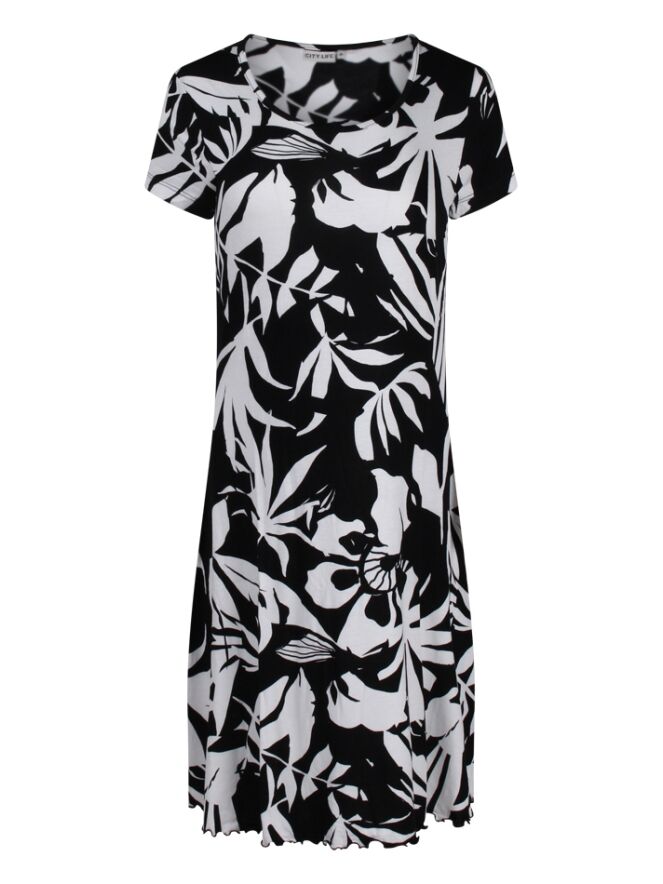 Deze damesjurk met grafische print is gemaakt van een soepel vallende stof die licht en luchtig aanvoelt, perfect voor warme zomerdagen. De moderne print geeft de jurk een trendy uitstraling, terwijl de comfortabele pasvorm zorgt voor ultiem draagplezier. Ideaal voor een dagje uit, een vakantie of een casual zomerfeest!