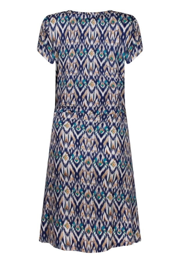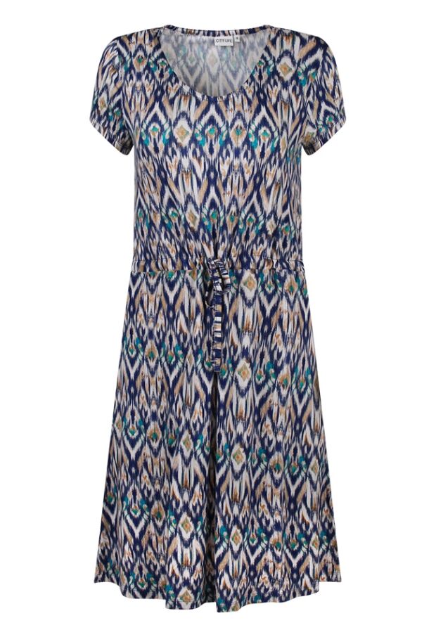 Deze damesjurk met trendy ikatdessin is een stijlvolle keuze voor zomerse dagen. In de taille zit een tunnel met een koordje, waarmee je de jurk mooi kunt tailleren. Het luchtige ontwerp zorgt voor extra draagcomfort.