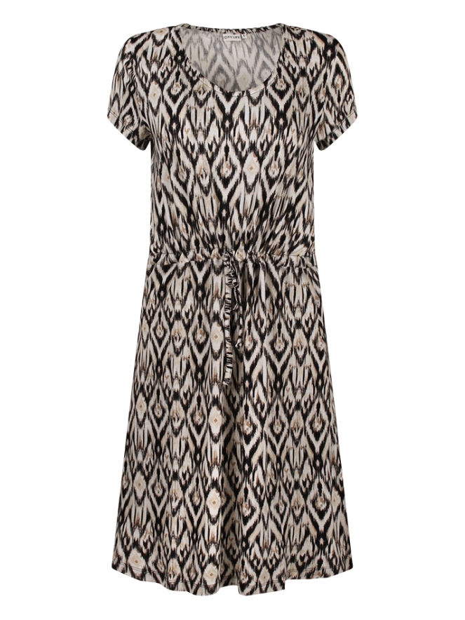 Deze damesjurk met trendy ikatdessin is een stijlvolle keuze voor zomerse dagen. In de taille zit een tunnel met een koordje, waarmee je de jurk mooi kunt tailleren. Het luchtige ontwerp zorgt voor extra draagcomfort.