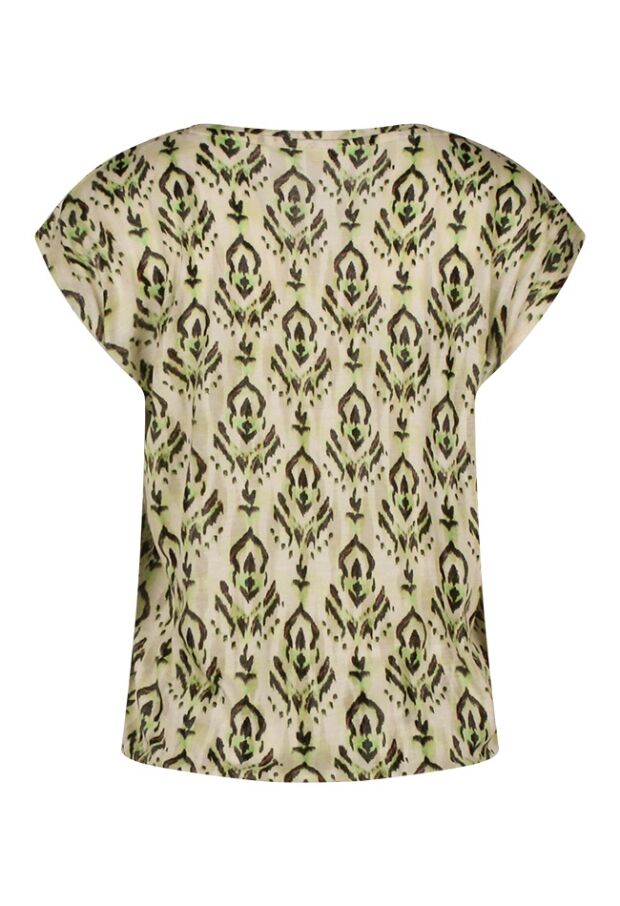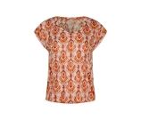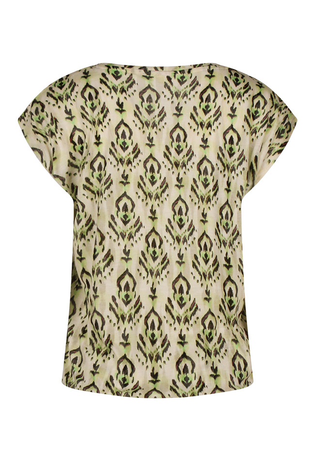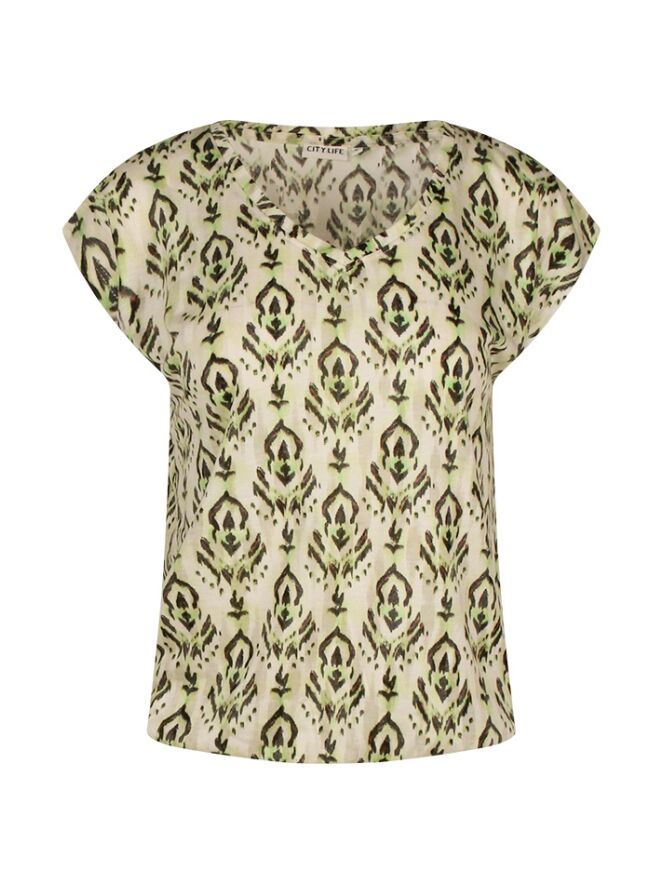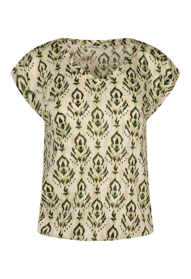 Dit luchtige T-shirt van Citylife uit de zomercollectie straalt comfort en stijl uit dankzij de bijzondere Ausbrenner kwaliteit en het trendy ikatdessin. De zachte kapmouwtjes en V-hals geven een vrouwelijke uitstraling, terwijl het elastiek onder in de band zorgt voor een mooie blousende fit. Een perfecte combinatie van nonchalante elegantie en zomerse flair ? ideaal om te dragen op een jeans, rok of short voor een relaxte, maar verzorgde look.