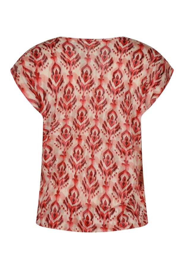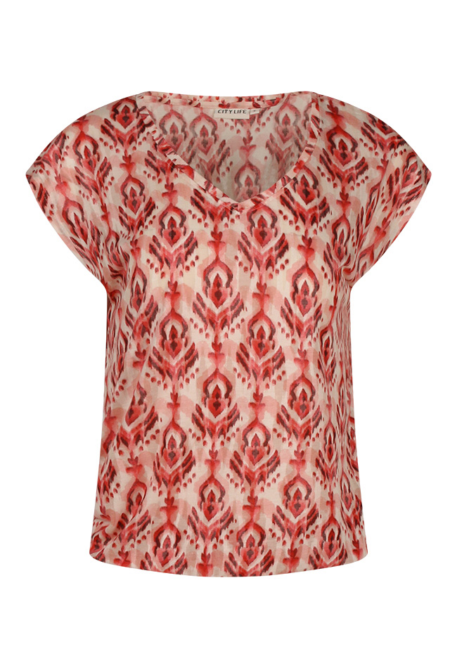 Dit luchtige T-shirt van Citylife uit de zomercollectie straalt comfort en stijl uit dankzij de bijzondere Ausbrenner kwaliteit en het trendy ikatdessin. De zachte kapmouwtjes en V-hals geven een vrouwelijke uitstraling, terwijl het elastiek onder in de band zorgt voor een mooie blousende fit. Een perfecte combinatie van nonchalante elegantie en zomerse flair ? ideaal om te dragen op een jeans, rok of short voor een relaxte, maar verzorgde look.