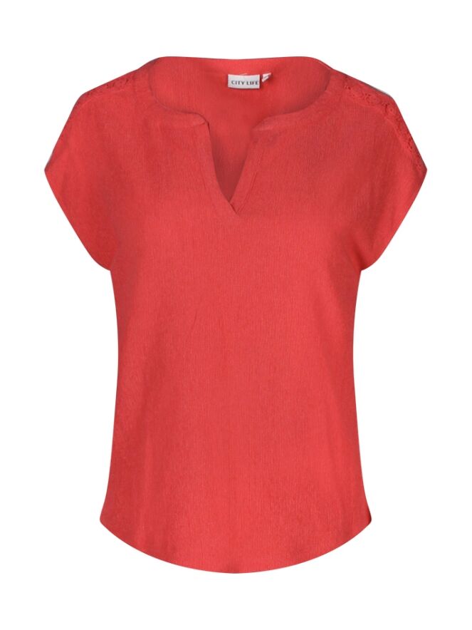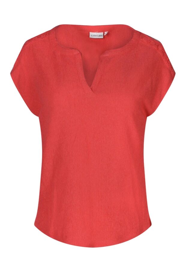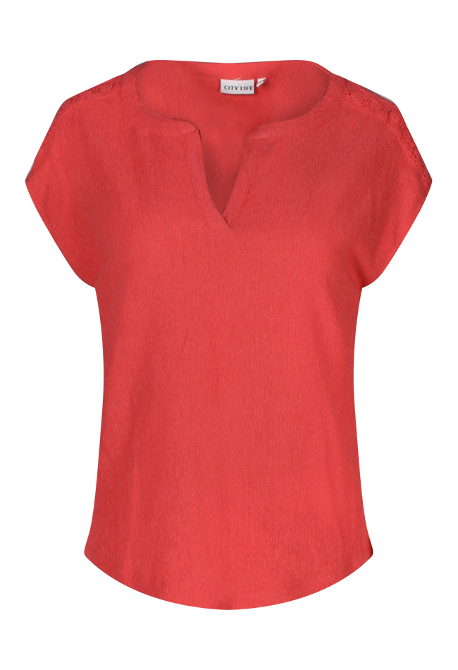 Deze luchtige dames top van Citylife is gemaakt van een comfortabele crinkle stof met een vleugje stretch. De V-hals zorgt voor een verfijnde look, terwijl de kanten band op de schouders een subtiel romantisch accent toevoegt.