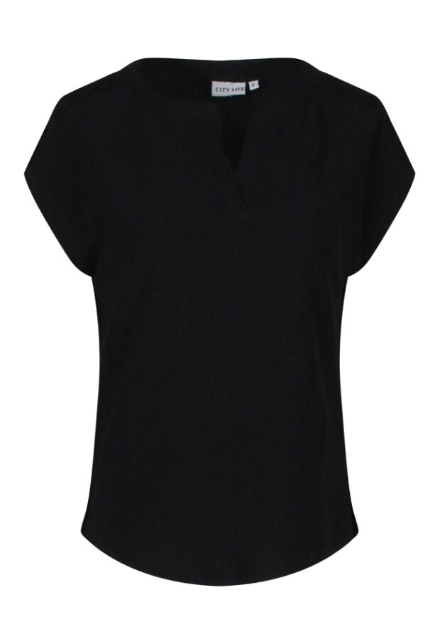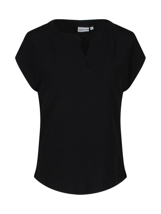 Deze luchtige dames top van Citylife is gemaakt van een comfortabele crinkle stof met een vleugje stretch. De V-hals zorgt voor een verfijnde look, terwijl de kanten band op de schouders een subtiel romantisch accent toevoegt.
